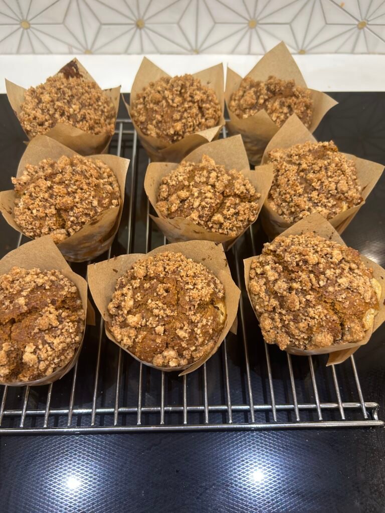 9. If using the streusel topping, sprinkle about 1 tablespoon of topping on each muffin and gently press it in so it doesn't fall off when baking.